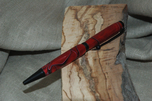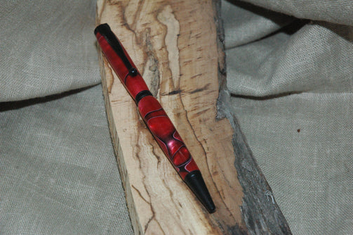 Un stylo au look psychédélique dans des teintes rouges et noires. Réalisé à partir d'une résine tournée au tour à bois dans l'Atelier du Vieux Tilleul.
