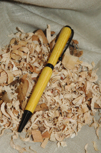 Un stylo en bois d'Oranger des Osages dans des teintes jaunes orangées. L'oranger des Osages est originaire d'Amérique du Nord, il s'agit d'un arbre remarquable par ses fruits. Historiquement, la qualité du bois permettait la fabrication d'arcs par les Indiens Osages d'où son deuxième nom "bois d'arc".