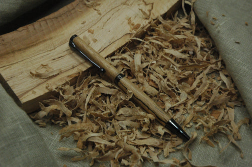 Ce stylo est tourné d'après du bois de hêtre échauffé. Sur la partie basse, il présente des zébrures noires, caractéristiques de l'échauffement du bois.