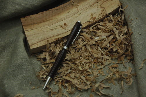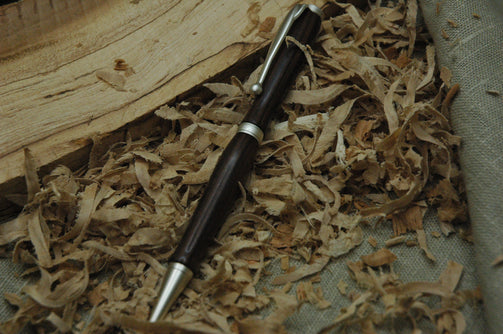 Les palissandres sont des bois très denses et résistants pouvant présenter différentes couleurs : ici, le stylo présente une teinte noisette renforcée de veines sombres.