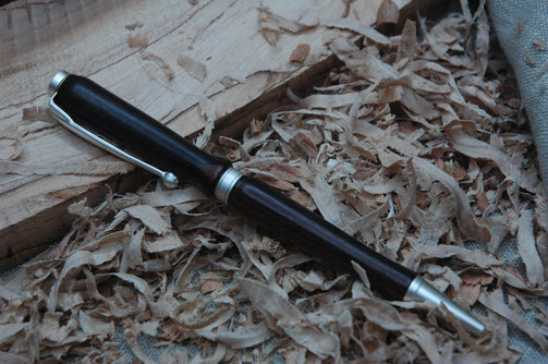 Les palissandres sont des bois très denses et résistants pouvant présenter différentes couleurs : ici, le stylo présente une teinte noisette renforcée de veines sombres. Celui-ci provient de Madagascar.