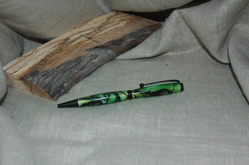 Un stylo au look psychédélique dans des teintes vertes et noires. Réalisé à partir d'une résine tournée au tour à bois dans l'Atelier du Vieux Tilleul.